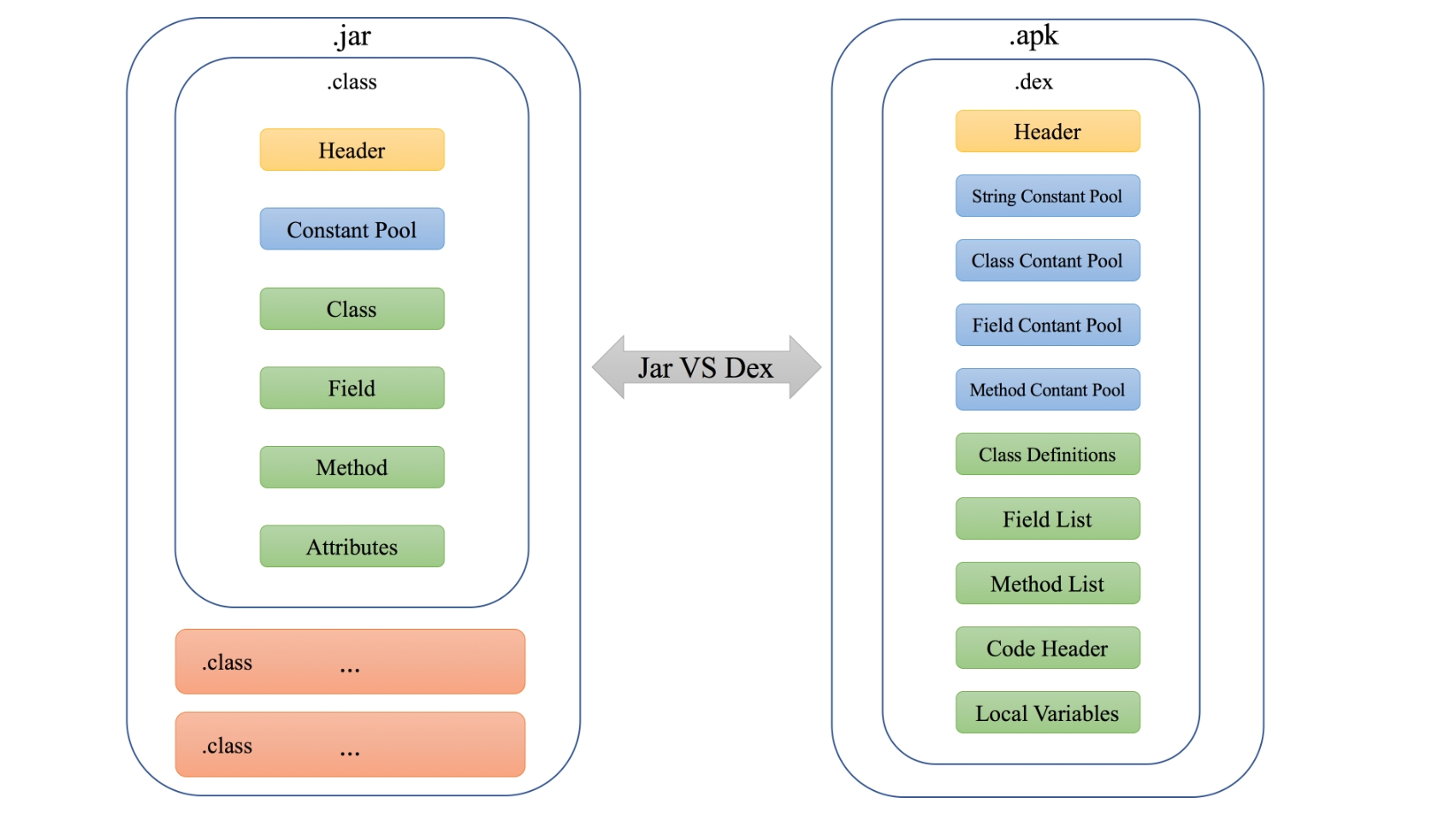 而在.apk文件中只包含了一个.dex文件,这个.dex文件里面将所有的.class里面所包含的信息全部整合在一起了,这样再加载就提高了速度。.class文件存在很多的冗余信息,dex工具会去除冗余信息,并把所有的.class文件整合到.dex文件中,减少了I/O操作,提高了类的查找速度。