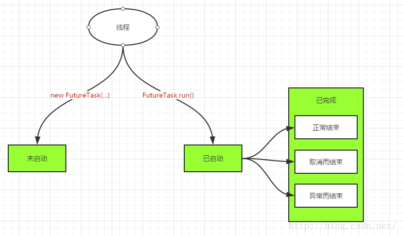 (1)未启动,FutureTask.run()方法还没有被执行之前,FutureTask处于未启动状态,当创建一个FutureTask,而且没有执行FutureTask.run()方法前,这个FutureTask也处于未启动状态。