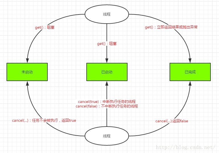 下面我们再来看看FutureTask的方法执行示意图(方法和Future接口基本是一样的,这里就不过多描述了)